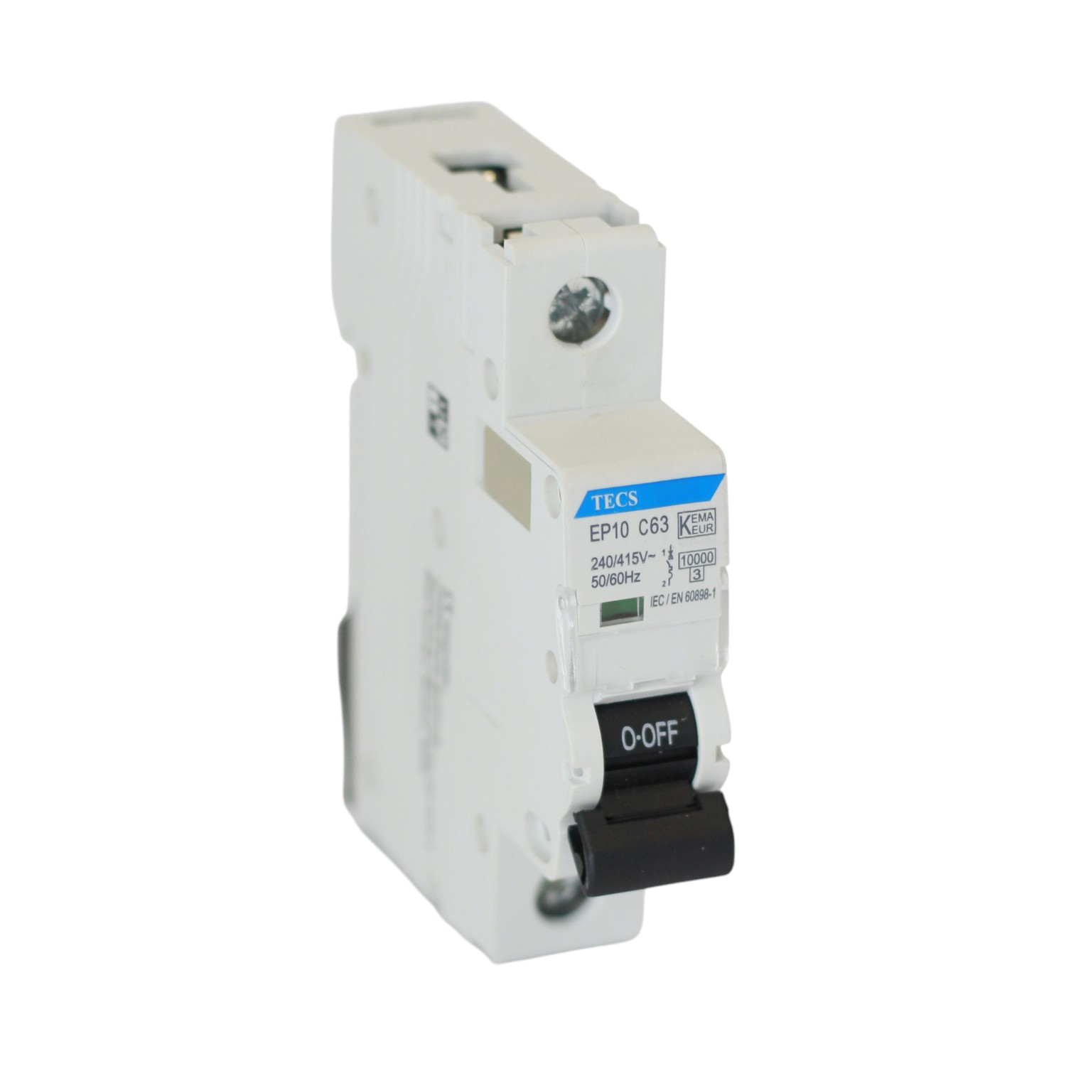 Interruptor Modular Automático riel DIN (MCB), de 1 polo, corriente nominal de 10A, capacidad máxima de ruptura Icu 10kA, y curva C.