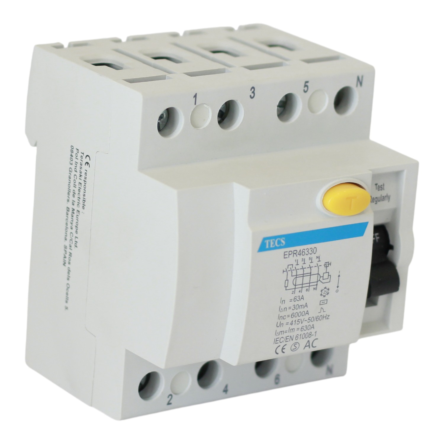 Interruptor Diferencial TECS (RCCB), de 4 polos, corriente nominal de 63A, corriente de fuga 300 mA, tipo de carga AC.
