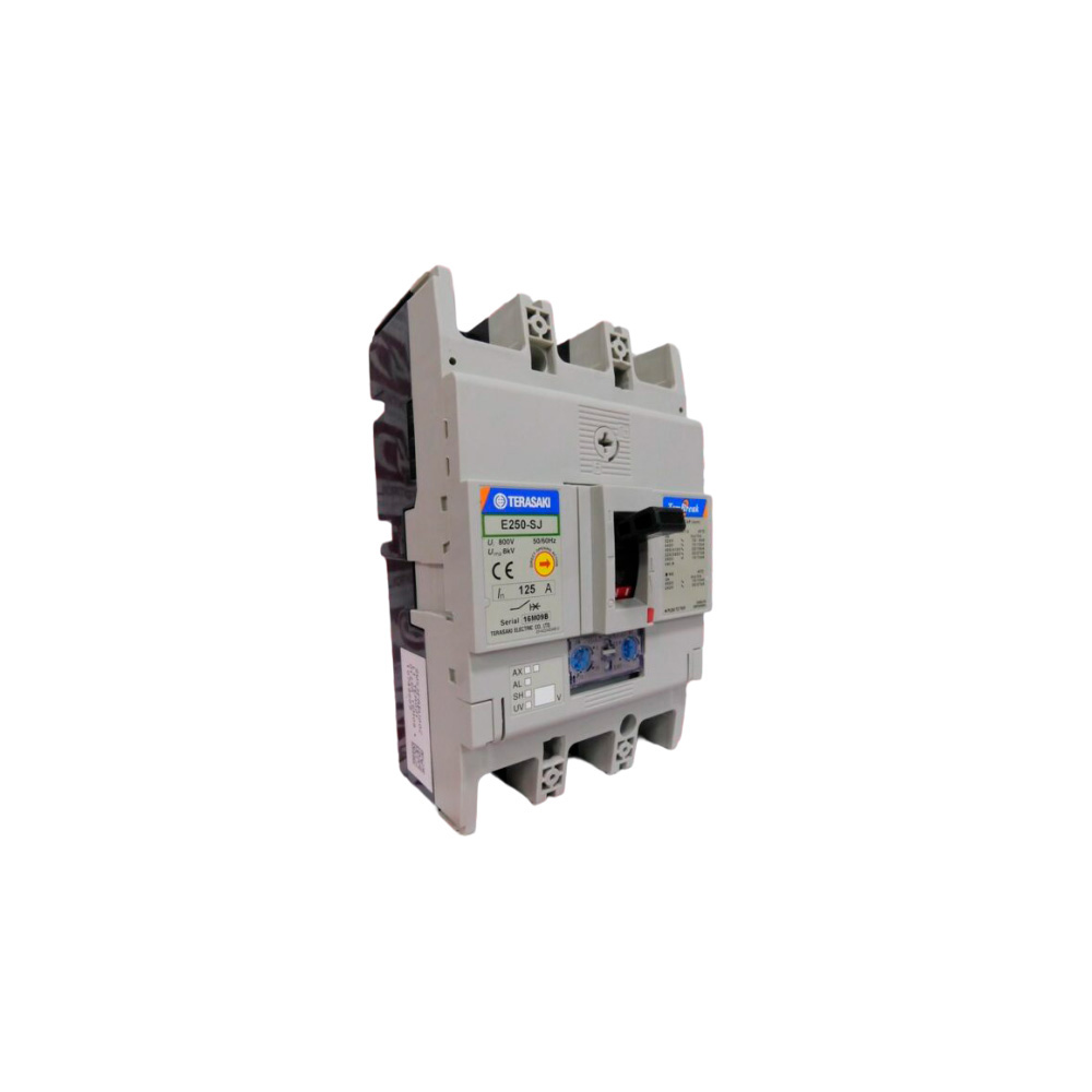 Interruptor automático modelo E250-SJ de caja moldeada (MCCB), de 4 polos, Conexión Frontal (FC), con una corriente nominal de 200A, capacidad máxima de ruptura Icu 25kA, y protección regulable (ajuste térmico).