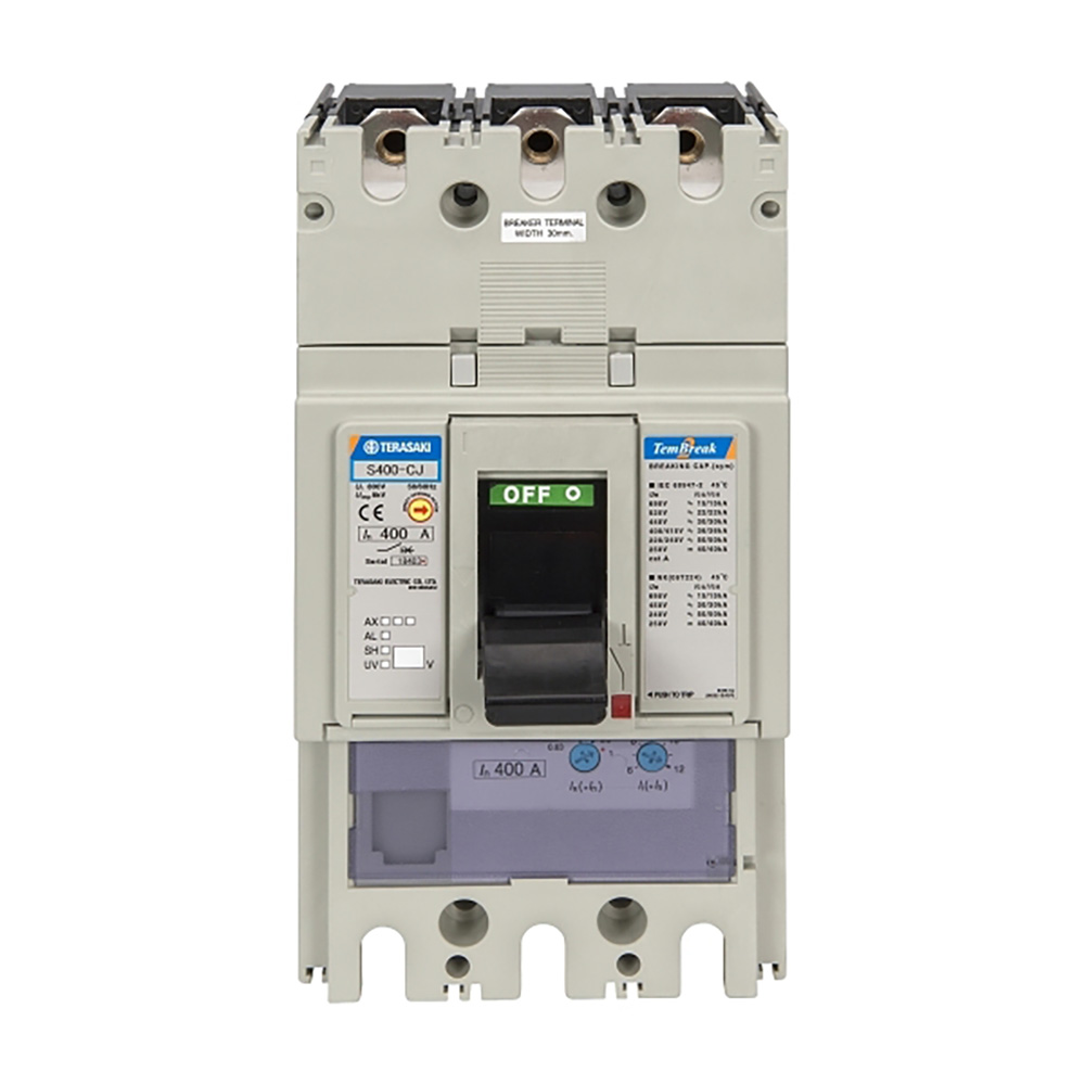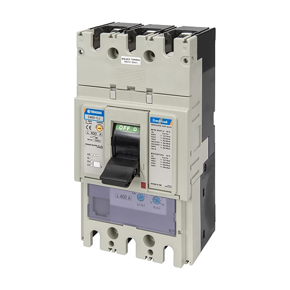 Interruptor automático modelo S400-CJ de caja moldeada (MCCB), de 3 polos, Conexión Frontal (FC), con una corriente nominal de 400A, capacidad máxima de ruptura Icu 36kA, y protección regulable (ajuste térmico).