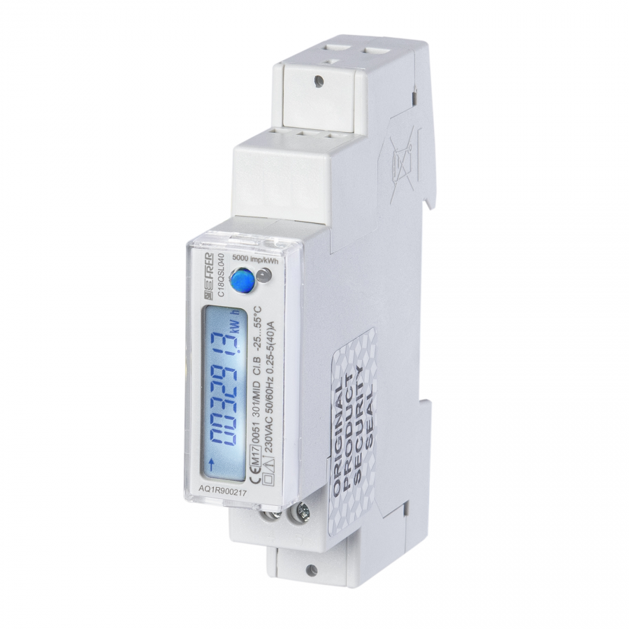 El Contador de Energía Digital Certf. MID Monofásico con instalación a riel DIN 230V-40A Pulso, cuenta con pantalla que muestra el consumo, el voltaje, la corriente y el factor de potencia en tiempo real.