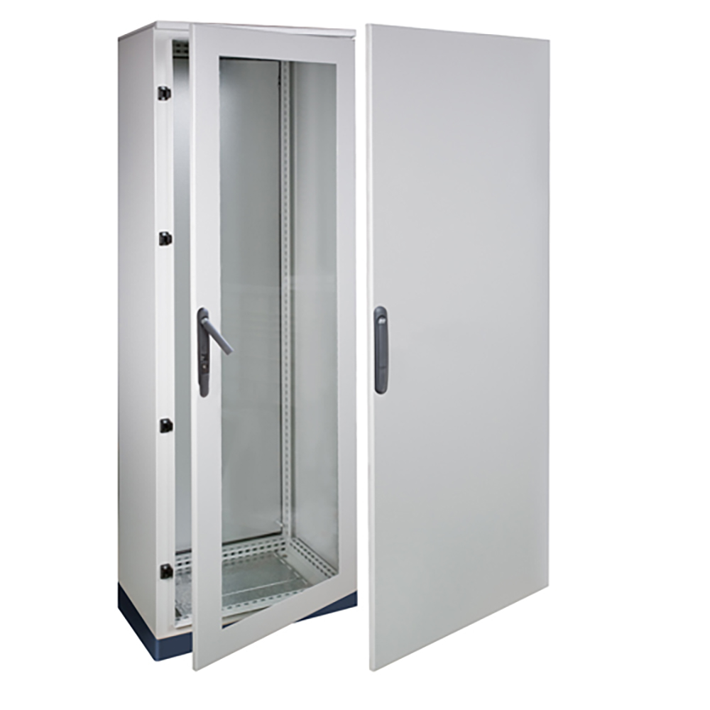 Puerta Única de Acero Laminado en Frío, Imprimado y Pintado para armario de 2200 mm de alto por 800 mm de ancho. Incorpora cierre de 4 puntos, inserto doble-bit con maneta escamoteable gris RAL 7016. Incluye pack de bisagras y retenedor.